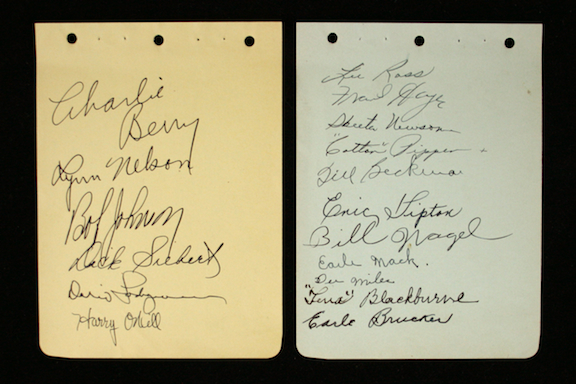 Description:1939 Philadelphia Athletics team-signed album sheets with scarce Harry O'Neill signature (EX/MT). Includes (2) 4.5"x6" autograph album sheets. One signed by (6) including Harry O'Neill (died in 1945 at Iwo Jima); Charlie Berry, Lynn Nelson, Bob Johnson, Dick Siebert, and Dario Lodigiani. And one signed by (11) including Buck Ross, Frank Hayes, Skeeter Newsom, Cotton Pippen, Bill Beckman, Eric Tipton, Bill Nagel, Earle Mack, Dee Miles, Lena Blackburne, and Earle Brucker. All are signed in ink and rate 9-10 out of 10: EX/MT.