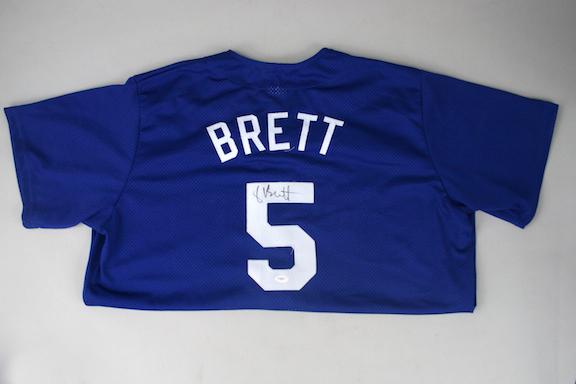 Description:George Brett signed Kansas City Royals jersey JSA. (EX/MT-NM) Martin Sports size 2XL jersey featuring "ROYALS" sewn across front, with "BRETT" and "5" sewn on back. Brett signed his number in black marker. Signature rates 9 out of 10. Comes with COA from JSA (serial #ed sticker is affixed): EX/MT-NM