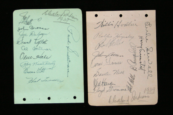 Description:1939 Cleveland Indians team-signed album sheets (EX/MT). Includes (2) 4.5"x6" autograph album sheets. One is signed by (11) including Bob Feller (twice), Luke Sewell, Harry Eisenstat, Bruce Campbell, Willis Hudlin, Rollie Hemsley, Johnny Allen, Oscar Grimes, Skeeter Webb, Mel Harder, and Floyd Stromme. And one signed by (10) including Paul Sullivan, John Broaca, Joe Dobson, Frank Pytlak, Al Milnar, Odell Hale, Roy Weatherly, Oscar Vitt, and Hal Trosky. All are signed in ink and rate 8-10 out of 10: EX/MT
