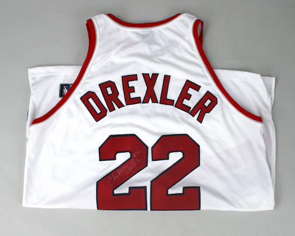 Description:Clyde Drexler signed and inscribed Portland Trail Blazers jersey. (EX/MT) Nike size 56 (3XL) jersey featuring "BLAZERS" and NBA logo patch sewn on front, with "DREXLER" and "22" sewn on back. Drexler signed the back in silver marker and added "#22" inscription. Signature rates 9 out of 10. Jersey is unworn, with retail tags still attached. A light, small stain is present near top of back side of jersey: EX/MT