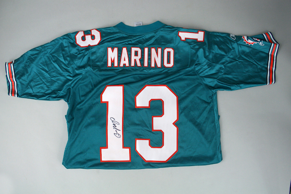 Description:Dan Marino signed Miami Dolphins jersey. (EX/MT-NM) Reebok size L Dolphins jersey featuring NFL logo patch sewn on front under the collar, with "13" also sewn on front. "13" is sewn on both shoulders, with the Dolphins logo imprinted on both sleeves. "MARINO" nameplate and "13" are sewn on back. Marino signed the back in black marker. Signature rates 9 out of 10: EX/MT-NM