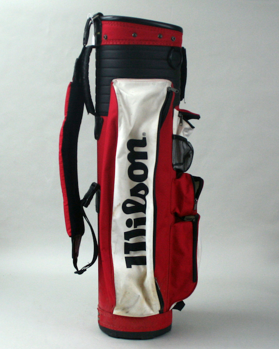 Description:Michael Jordan personal Wilson black and red golf bag. (EX) Wilson Staff black and red golf bag with "Wilson" imprinted down the side, and Wilson logo along with "Staff" embroidered on front and side pouches. Exhibits moderate usage wear with a few areas of surface soiling evident. The offered golf bag originated from the personal collection of Michael Jordan and includes COA from Upper Deck Authenticated: EX