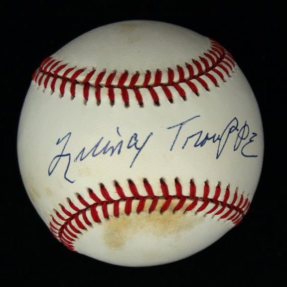 Description:Quincy Trouppe single-signed B.Brown AL baseball d.1993 (EX-EX/MT). Trouppe signed the sweet spot in blue ink. Signature rates 9/10 out of 10. Ball exhibits a few toning spots: EX-EX/MT