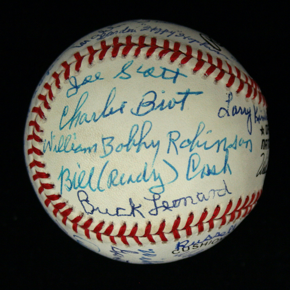 Description:Negro Leaguer multi-signed baseball with (26) signatures (NM). W.White NL ball signed by Buck Leonard, Leon Day, Ted Radcliffe, Ray Dandridge, Bill (Ready) Cash, Charlie Biot, Wilmer Fields, Al Wilmore, Max Manning, Gene Benson, Stanley Glenn, Andy Porter, Mahlon Duckett, Jim Cohen, and others. Signatures rate 8-10 out of 10: NM