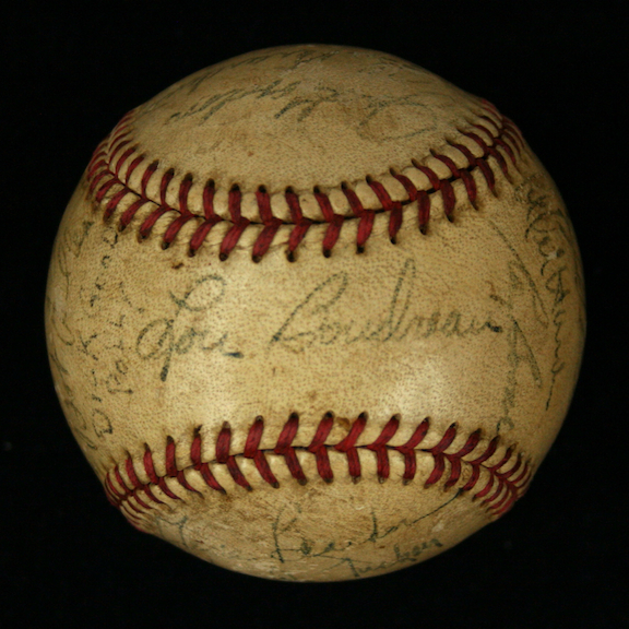 Description:1949 Cleveland Indians team-signed W.Harridge AL baseball (VG/EX). (22) members of the team signed the ball including Bob Feller, Lou Boudreau, Early Wynn, Luke Easter, Bob Lemon, Mickey Vernon, Joe Gordon, Ray Boone, Jim Hegan, Bob Avila, Milt Nielsen, and others. Signatures rate 6-7 out of 10 on average and range 4-7 out of 10: VG/EX