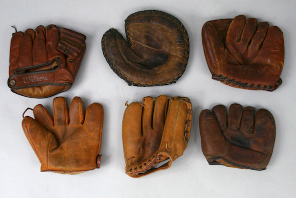 Description:Lot of (9) vintage baseball gloves, c.1910-1950s. (VG-EX) Incl. c.1910 GoldSmith crescent pad catcher's mitt (VG); c.1930s Wards 3556 model glove (VG-VG/EX); c.1930s Varsity C580 model child's size 1st baseman mitt (VG); c.1940s J.C. Higgins 1759 model glove (VG/EX); c.1940s Nokona J103 model glove (VG); c.1950s BLS F10 model glove endorsed by Stan Musial (VG-VG/EX); c.1950s Wilson A2151 model glove endorsed by Jim Greengrass (VG, missing laces); c.1950s Wilson A2943 Ball Hawk Six model glove for left handed thrower (VG/EX with note to name written on glove); and c.1950s Wilson A9830 model softball glove (VG/EX-EX). Range: VG-EX