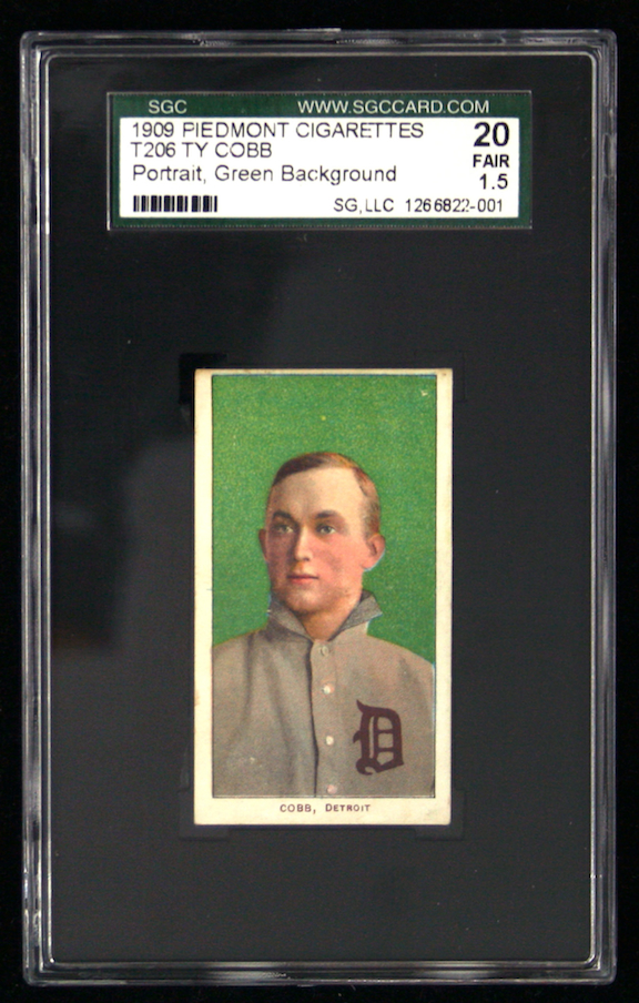 Description:1909-11 T206 Ty Cobb green portrait (EX appearance, SGC 20 FR). Piedmont back. Displays as EX from the front with very light corner wear and strong color and registration. The back exhibits light age toning and has a small area of surface loss on the left upper edge. Graded SGC 20: FR