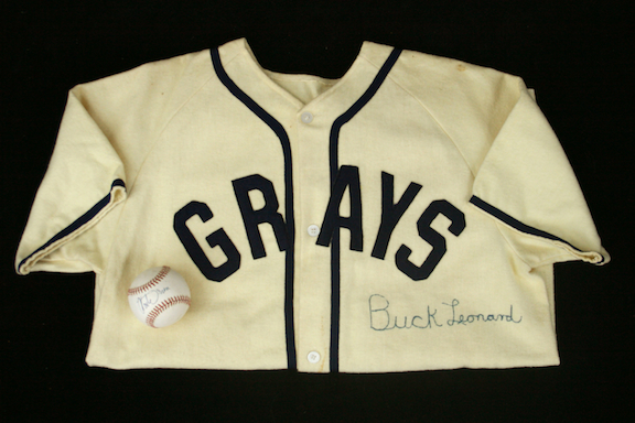 Description:Buck Leonard signed Homestead Grays jersey, and Monte Irvin signed baseball. (EX-EX/MT) Incl. untagged Homestead Grays jersey with "32" sewn on back, signed on the front by Buck Leonard in blue marker rating 9 out of 10 (EX with stain on front near buttons); and W.White NL ball signed by Monte Irvin in blue ink rating 9 out of 10 (EX/MT). Range: EX-EX/MT