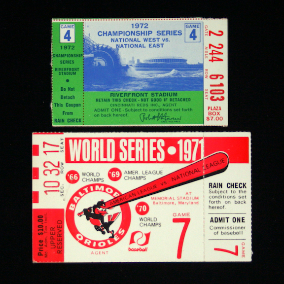 Description:1971 World Series Game 7, and 1972 NLCS Game 4 ticket stubs, Clemente's last HR. (EX) Incl. ticket stub from Game 7 of the 1971 World Series between the Pittsburgh Pirates vs Baltimore Orioles in which Roberto Clemente hit a HR (EX); and ticket stub from Game 4 of the NLCS between the Pirates vs Cincinnati Reds in which Clemente hit the final HR of his career (EX appearance, score written on back): EX