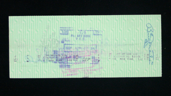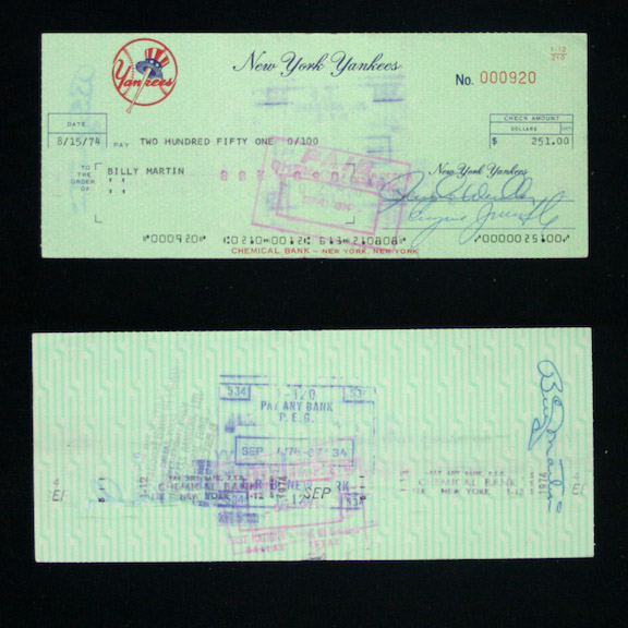 Description:Billy Martin signed New York Yankees check dated 1974. (EX) New York Yankees check made out to Martin and dated 8/15/74. Martin signed the back of the check in blue ink. Signature rates 9 out of 10: EX