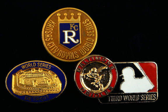 Description:1970 Baltimore Orioles, 1980 Kansas City Royals, and 1984 Detroit Tigers World Series press pins. (EX/MT-NM) Incl. 1970 Orioles pin (EX/MT, no engravings on back); 1980 Royals pin (EX/MT-NM, no engravings on back); and 1984 Tigers pin engraved "BALFOUR" on back (NM). Range: EX/MT-NM