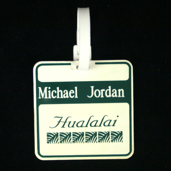 Description:Michael Jordan personal Hualalai Golf Club golf bag tag (EX). 3 5/8" square plastic golf bag tag personalized with "Michael Jordan" lettering on one side with "Hualalai" beneath. The other side reads "Hualalai Golf Club - Kaupulehu-Kona, Hawaii, 96740" with Jack Nicklaus facsimilie signature and "A Signature Golf Course" benteath. Original band is still attached. The offered golf bag tag originated from the personal collection of Michael Jordan and includes COA from Upper Deck Authenticated: EX