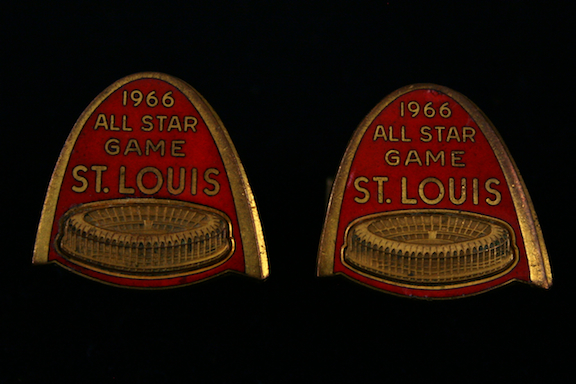 Description:Pair of 1966 St. Louis All Star Game cufflinks by Balfour. (EX/MT-NM) Front of each features an embossed image of Busch Stadium and reads "1966 All Star Game ST. LOUIS". "BALFOUR" is engraved on the back of each: EX/MT-NM