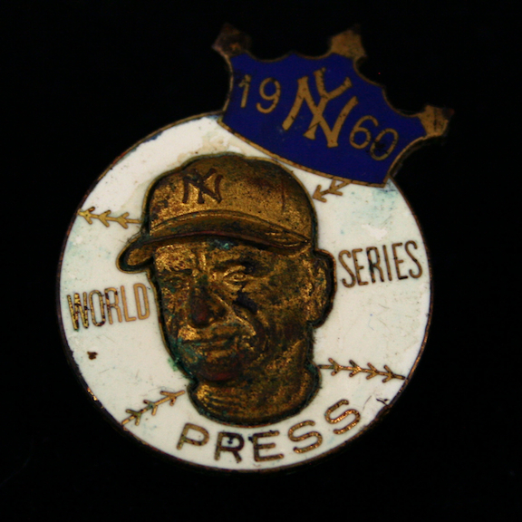 Description:1960 New York Yankees World Series press pin. (VG-VG/EX) Original pin, with "BALFOUR" engraved on back. Includes original clasp on back. Exhibits areas of surface corrosion: VG-VG/EX