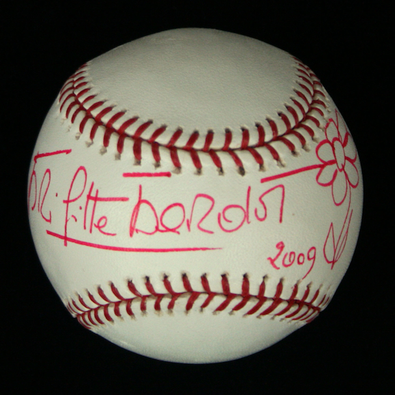 Description:Brigitte Bardot single-signed and inscribed B.Selig MLB baseball. (EX/MT-NM) Bardot signed the sweet spot in red ink and added "2009" date along with a hand drawn flower. Signature rates 9 out of 10: EX/MT-NM