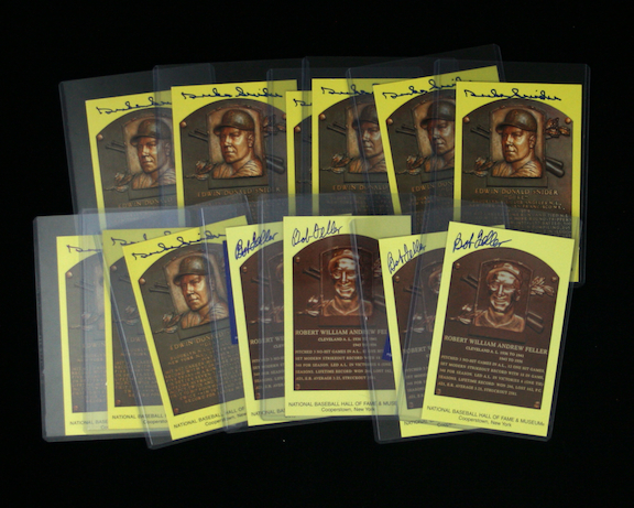 Description:Lot of (4) Bob Feller and (9) Duke Snider signed yellow HOF postcards PSA/DNA. (EX-NM) Incl. (4) yellow HOF postcards signed by Bob Feller in blue marker; and (9) yellow HOF postcards signed by Duke Snider in blue marker. Signatures rate 8 to 9/10 out of 10. Each comes with COA from PSA/DNA (serial #ed stickers are affixed). Postcards appear to grade EX/MT overall. Range: EX-NM