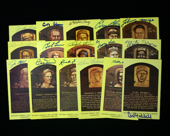 Description:Lot of (16) Baseball HOFer signed yellow HOF postcards, with deceased. (EX-NM) Incl. Bob Doerr, Rick Ferrell, Charlie Gehringer, Billy Herman, Carl Hubbell, Jim Catfish Hunter, Monte Irvin, George Kell, Ralph Kiner, Bob Lemon, Buck Leonard, Johnny Mize, Enos Slaughter, Bill Terry, Happy Chandler, and Jocko Conlan. Ink and marker signatures rate 7/8 to 9/10 out of 10. Postcards appear to grade EX/MT overall. Range: EX-NM