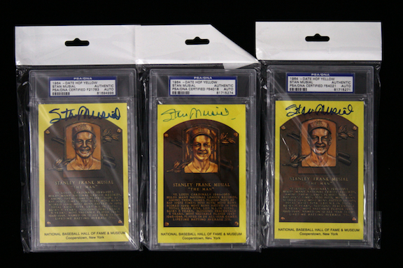Description:Lot of (3) Stan Musial signed yellow HOF postcards PSA/DNA. (EX/MT-NM) Musial signed the front of each postcard in blue marker. Signatures rate 9 to 9/10 out of 10. Each is encased in PSA/DNA holder, and comes with COA from PSA/DNA: EX/MT-NM