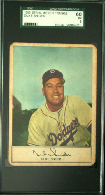 Description:UPDATED PHOTO: 1953 Stahl-Meyer Franks Duke Snider (SGC 60 EX). Tough issue to find in high grade due to the way they were packaged. This example exhibits minimal wear other than light surface toning/spotting. The back surface is notably clean overall. Graded SGC 60: EX