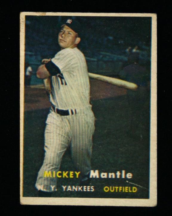 Description:1957 Topps #95 Mickey Mantle (VG). Exhibits lightly rounded corners and a very small spot of surface loss on the top border of the front. Clean front and back: VG