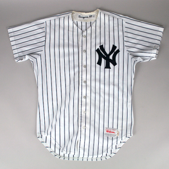 Description:1987 Dan Pasqua New York Yankees professional model home jersey (EX-EX/MT). Knit button down jersey with "NY" logo on front left and "21" on back. Retains its original Wilson size 44 "tapered" tagging on front lower left and "Pasqua 87 1" strip tag in collar. Exhibits moderate usage and wash wear: EX-EX/MT