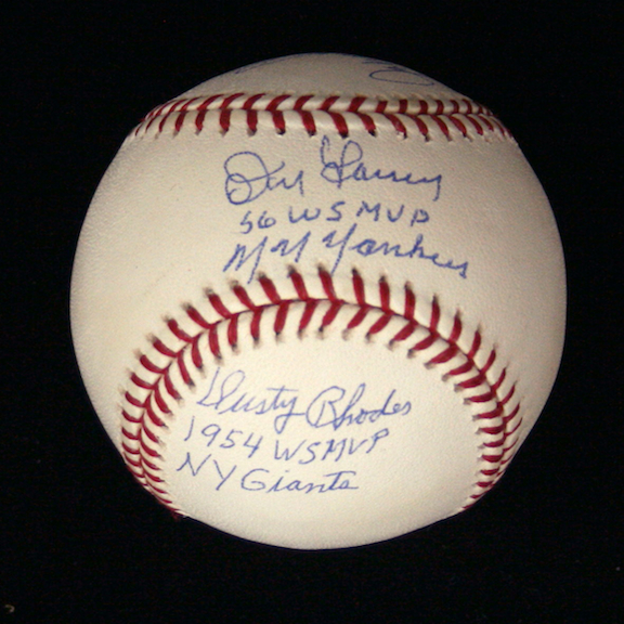 Description:Don Larsen, Johnny Podres, and Dusty Rhodes multi-signed and inscribed baseball (EX/MT-NM). B.Selig ML ball signed by Don Larsen with "56 WS MVP NY Yankees" inscription, Johnny Podres with "55 WS MVP Brooklyn Dodgers" inscription, and Dusty Rhodes with "1954 WS MVP NY Giants" inscription. Blue ink signatures rate 9 to 10 out of 10: EX/MT-NM