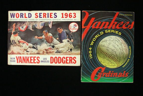 Description:1963 and 1964 New York Yankees World Series programs (VG/EX-EX). Includes 1963 Yankees vs. Dodgers program with unscored interior scorecard (exhibits light age toning/spotting on the edges of the front cover); and a 1964 Yankees vs. Cardinals program scored in ink for game 3 of the series: VG/EX-EX