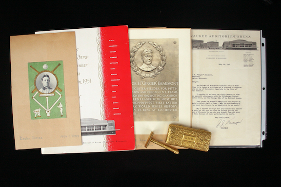Description:Lot of misc. items related to Clarence "Ginger" Beaumont c.1908-1951 (EX overall). Includes a 1908-09 PC760 Rose Company Ginger Beaumont postcard (EX appearance but is affixed to a scrapbook backing), a 1910 gold plated Gillette Safety Razor Pocket Edition with original case inscribed with Beaumont's initials "C.H.B." on the top of the razor and on top of the case (serial # on the razor is B336898, which dates the razor to 1910, EX); and (3) items related to Beaumont's induction into the Wisconsin Hall of Fame: Event menu/program (VG/EX), presentational 8"x10" print of Beaumont's HOF plaque (Ex appearance, but affixed to a scrapbook backing); and signed typed letter from J.J. Krueger to Beaumont congratulating him on his induction into the Wisconsin HOF (EX).