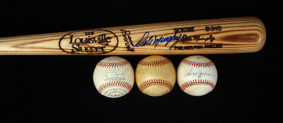 Description:Lot of (4) Baseball HOFer/Star signed items (VG/EX-NM). Includes: Dale Murphy signed Lousiville Slugger B310 professional model bat (unused bat signed in blue sharpie, signature rates 9 out of 10, NM); Reggie Jackson single-signed B.Brown AL ball (personalized "To Dan", ball is lightly toned, signature rates 8 out of 10, EX); Ernie Banks single-signed W.White NL ball (ball is heavily toned, signature rates 6/7 out of 10, VG/EX), and Lou Brock single-signed HOF Induction commemorative ball (signature rates 9 out of 10, EX-EX/MT).