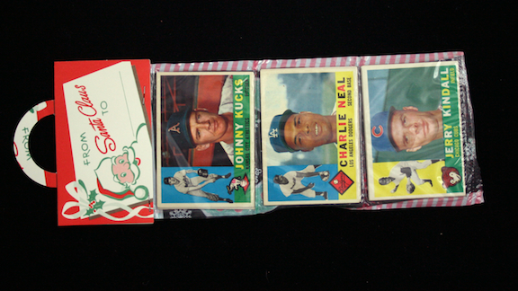 Description:1960 Topps Baseball Christmas rack pack (EX/MT, partially opened). Contains (12) 1960 Topps cards. Pack was issued by an independent entity (not Topps). The cards appear to be in EX-EX/MT condition. Pack appears to be unsearched, but the original seal on the left side of the top section of cards has come undone leaving an opening in the pack: EX/MT overall