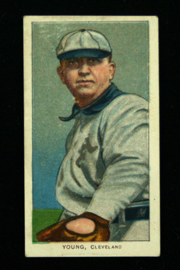 Description:1909-1911 T206 Cy Young baseball card. (GD) Variation in which Young's glove is showing. VG/EX in appearance with nice centering, light corner wear, and an area of surface wrinkling on front. A very small area of paper loss is present on back: GD