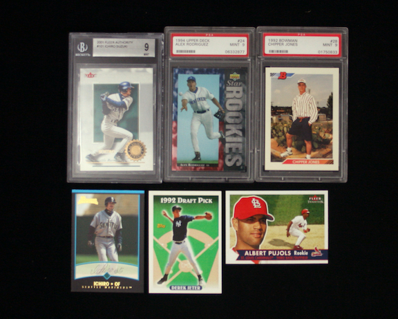Lot of (17) Baseball rookie cards from 1990-2001, with graded. (EX/MT-MT) Incl. 1990 Upper Deck #17 Sammy Sosa (NM); 1991 Classic Best #268 Chipper Jones graded Mint Grading 10 (GEM MT); 1992 Bowman #28 Chipper Jones graded PSA 9 (MT); (2) 1993 Topps #98 Derek Jeter (EX/MT-NM); 1993 Topps Gold #98 Jeter (NM); 1993 Upper Deck #449 Jeter (EX/MT); 1994 Upper Deck #24 Alex Rodriguez graded PSA 9 (MT); (2) 2001 Bowman Draft Picks & Prospects #BDP84 Ichiro Suzuki (both NM); 2001 Bowman Heritage #352 Ichiro Suzuki (NM); 2001 Donruss #195 Ichrio Suzuki (NM); 2001 Donruss The Rookies #R104 Ichiro Suzuki (NM); 2001 Fleer Authority #101 Ichiro Suzuki graded Beckett 9 (MT); 2001 Fleer Tradition #452 Albert Pujols (NM); 2001 Topps Traded #T247 Pujols (NM); and 2001 Upper Deck Reserve #204 Pujols (NM). Range: EX/MT-MT