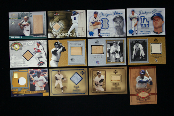 Description:Lot of (12) Baseball star and HOFer game used swatch cards, with Derek Jeter. (EX/MT-NM) Incl. 2001 Donruss Classics "Benchmarks" #BM9 Reggie Jackson game used stadium bench card; 2001 Fleer Authority "Diamond Cuts" Derek Jeter game used bat card; 2001 Fleer Greats Of The Game "Dodger Blues" Walter Alston game used uniform card; 2001 Fleer Greats Of The Game "Dodger Blues" Don Drysdale game used jersey card; 2001 Fleer Platinum "Lumberjacks" Roberto Alomar game used bat card; 2001 SP Game Bat "Piece of the Action" #B-TGW Tony Gwynn game used bat card; 2001 SP Legendary Cuts "Legendary Bat Cards" #B-RJ Reggie Jackson game used bat card; 2001 SP Legendary Cuts "Debut Bat Cards" #D-CG Charlie Gehringer game used bat card; 2001 SP Legendary Cuts "Legendary Game Uniform Cards" #J-NF Nellie Fox game used uniform card; 2001 Topps Reserve #TRR-TG Tony Gwynn game worn uniform card; 2001 Upper Deck Hall Of Famers "Cooperstown Collection" #J-OC Orlando Cepeda game used jersey card; and 2001 Upper Deck Hall Of Famers "Cooperstown Collection" #B-RJ Reggie Jackson game used bat card: EX/MT-NM