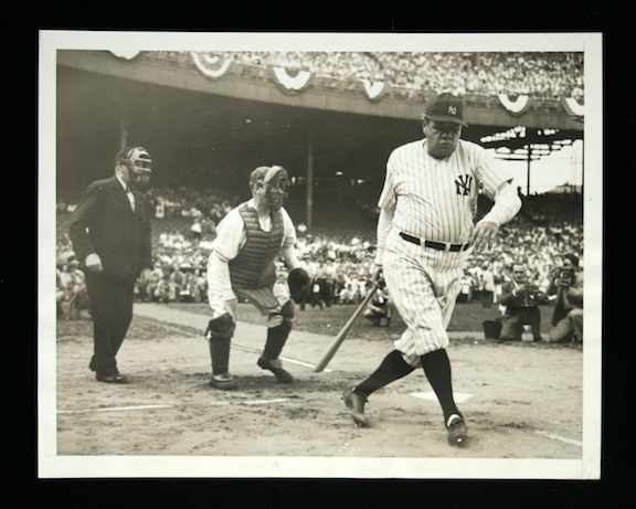 Description:Original 1943 Babe Ruth batting in Yankees uniform press photo (EX). 7"x9" photo depicting Ruth batting in Yankees uniform along with Roger Bresnahan catching and Bill Klem umpiring. Photo was taken at the Polo Grounds on August 26, 1943 before a War Bond Benefit Show. The back is stamped "Acme Newspictures Inc." and has the original press write-up dated 8/26/43 still affixed. Exhibits light wear to the bottom right corner: EX