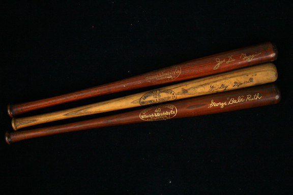 Description:Lot of (3) vintage Louisville Slugger mini bats including Ruth, DiMaggio, and Mantle c.1940s-50s (EX-EX/MT). Includes a 1940s Louisville Slugger 40 George "Babe" Ruth model (EX/MT, measures 16 1/4" long), 1940s Louisville Slugger 40 Joe DiMaggio model (EX, measures 16 1/4" long), and a 1950s Louisville Slugger 125 Mickey Mantle model (Ex with some surface spotting, measures 16" long).