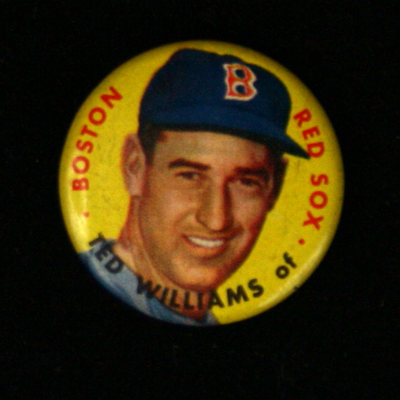 1956 Topps Ted Williams pin (EX). Retains strong color and remains very clean overall. Exhibits minimal surface wear: EX