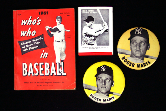 Description:Lot of (4) 1960s Roger Maris stadium pins and publications (EX). Includes (2) different 3 1/2" diameter Roger Maris PM10 stadium souvenir pins ((1) yellow and (1) cream); 1961 Roger Maris Batting Secrets flipbook (issued by David Blumenthal Associates Inc.); and a 1961 Who's Who in Baseball depicting Maris on the cover: EX overall.