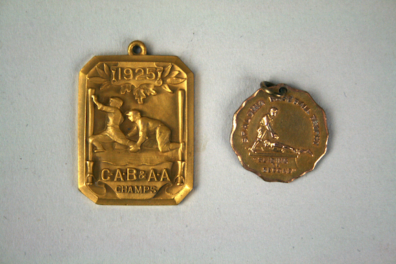 Description:Lot of (2) 1920s baseball pendants including Spalding Baseball Trophy (EX). Includes a 7/8" diameter Spalding Baseball Trophy "Sliding to Second" pendant (D&C makers mark on back, gold-filled); and a 1"x1 5/16" 1925 C.A.B.&A.A. Champs pendant (marked "College Shops Sterling" on the back): EX