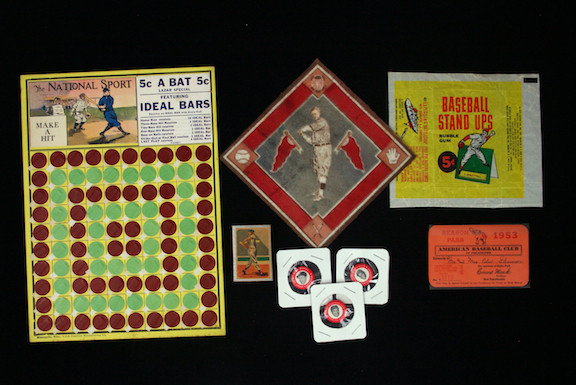 Description:Lot of misc. baseball memorabilia c.1910s-60s (VG/EX-EX/MT). Includes 1914 B18 Casey Stengel blanket (blue and grey infield, VG/EX); 1964 Topps Stand Ups wax pack wrapper (VG/EX), c.1940s "The National Sport" 5-cent pull tab board (unused, EX), 1953 Philadelphia Athletics Season pass (EX/MT), 1963 Ohio Blue Top match box with baseball player on cover (EX); and (7) misc. pins including 1950s Ted Williams, 1930 Cracker Jack Paul Waner, 1950 American Nut & Chocolate Boston Braves; (3) 1969 pins: J.Robinson, Campanella, and Musial: VG/EX-EX/MT