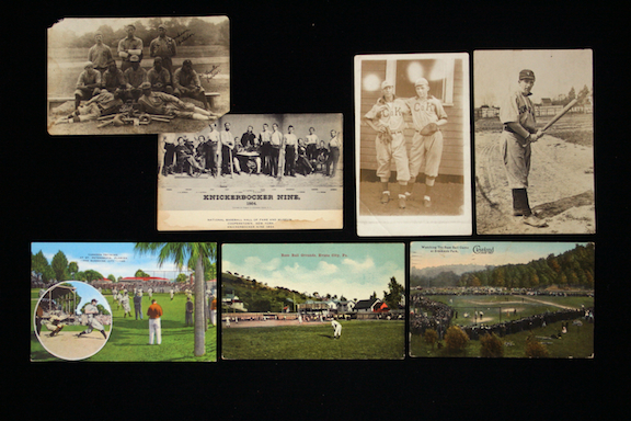 Description:Lot of (14) vintage postcards with (10) baseball related c.1909-1950s (GD/VG-EX/MT). Includes 1909 real photo postcard of the Bath, P.A. baseball team (GD/VG, period ink inscriptions on front, missing piece of lower right corner); 1910 real photo postcard of an unidentified uniformed player (VG/EX), c.1914 real photo postcard of two teenage baseball players wearing uniforms with "Co.K" on the fronts (VG-VG/EX); 1911 color postcard of the "Base Ball Grounds, Evans City, Pa." (VG/EX), 1914 color postcard titled "Watching the Base Ball Game at Brookside Park" (VG), (3) c.1940s-50s stadium postcards including (2) Yankee Stadium and Forbes Field (EX-EX/MT); c.1950s Yankees Spring Training postcard (EX/MT), c1950s Knickerbocker Nine postcard (VG), and (4) misc. real photo postcards c.1910 depicting members of the army (VG-VG/EX).
