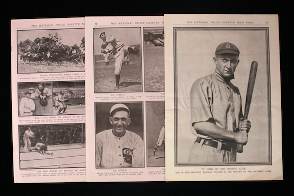 Description:Lot of (4) 1914-1924 National Police Gazette issues featuring Babe Ruth, Ty Cobb, Joe Jackson, and others (VG/EX-EX). Includes: August 1, 1914 issue which has a full interior page depicting Ty Cobb; a June 7, 1919 issue which depicts Joe Jackson, Tris Speaker, and Jack Dempsey (full page); an April 14, 1923 issue which depicts Babe Ruth with caption "Babe Ruth primed for assault on his home-run record"; and a September 6, 1924 issue which depicts Babe Ruth batting on an interior page. All exhibit light wear overall and are pinkish in color: VG/EX-EX