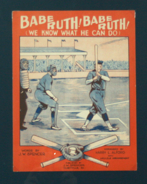 Description:1928 "Babe Ruth! Babe Ruth! (We Know What He Can Do)" sheet music and advertising pin (EX-EX/MT). Includes original 9 1/4"x12" sheet music with depiction of Ruth on the cover. Sheet music is housed in a 14"x17" frame. Also includes an original 1" advertising pin for the sheet music which states "Song 25 Cents": EX-EX/MT