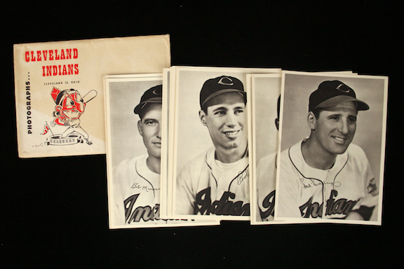 Description:1948 Cleveland Indians Player photo pack with original envelope (EX-NM). Complete set of (30) 6.5"x9" player photos including Satchel Paige, Hank Greenberg, Bob Feller, Lou Boudreau, Bob Lemon, Joe Gordon, and others. Includes original Cleveland Indians envelope. Photos exhibit minimal wear. The envelope exhibits light age toning: EX-NM