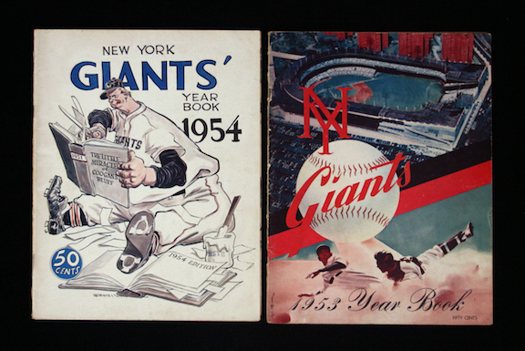 1953 and 1954 New York Giants yearbooks (EX). Both exhibit light edge and corner wear. Interior pages are clean and exhibit minimal wear: EX
