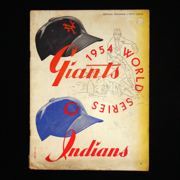 Description:1954 New York Giants World Series program (VG). Original Giants vs. Indians program scored in ink for game 2 of the series. Exhibits moderate cover wear and light wear to the interior pages: VG