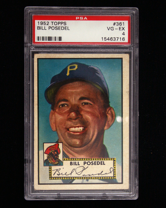 Description:1952 Topps #361 Bill Posedel (PSA 4 VG/EX). Exhibits light corner wear and light surface wrinkling on the lower left corner. Clean front and back. Graded PSA 4: VG/EX