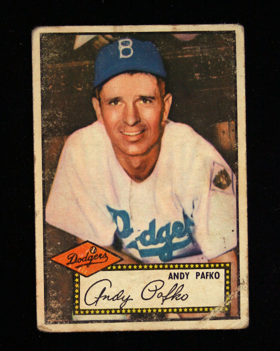 Description:1952 Topps #1 Andy Pafko red back (GD). Exhibits rounded corners, light surface wear, a light surface wrinkle on the right side, and a crease on the lower right corner. Clean back: GD