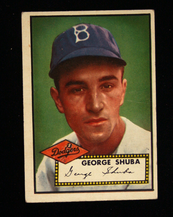 1952 Topps #326 George Shuba (VG). Exhibits light corner wear and has a light crease on the right side. Clean front and back: VG