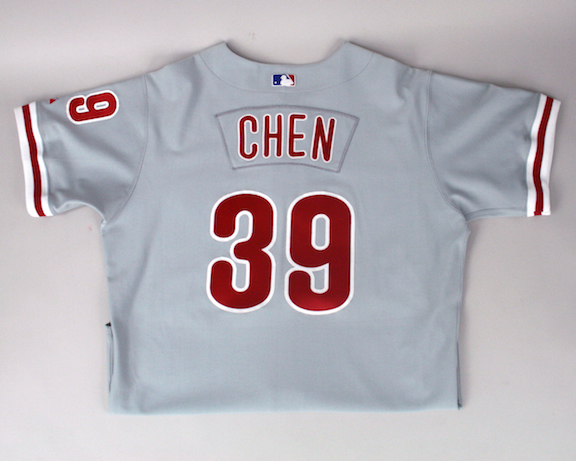 Description:Bruce Chen professional model Philadelphia Phillies jersey, c.2000-2001. (EX-EX/MT) Majestic size 48 Phillies jersey featuring "Phillies" script lettering sewn across front. Player number "39" is sewn on left sleeve and back, along with "CHEN" nameplate also sewn on back. MLB logo patch is sewn on back under collar. Majestic tagging is sewn on front left tail, with "48" flag tagged. 0062 wash tag is present inside jersey. Exhibits very little usage wear: EX-EX/MT