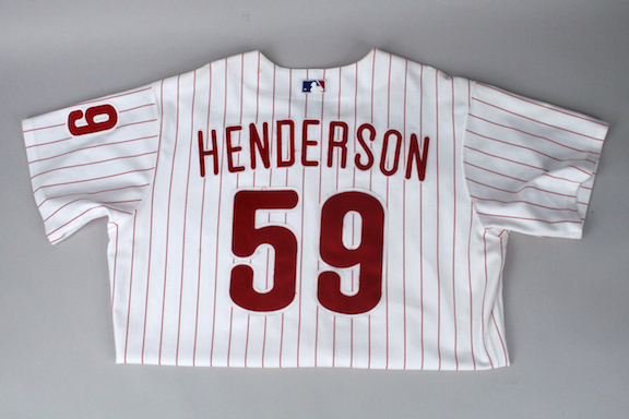 Description:Ramon Henderson professional model Philadelphia Phillies jersey, c.2000s. (EX) Majestic size 48 Phillies jersey featuring "Phillies" script lettering sewn across front. Number "59" is sewn on left sleeve and back, along with "HENDERSON" also sewn on back. MLB logo patch is sewn on back under collar. Majestic tagging is sewn on front left tail, with "48" flag tagged. 0062 wash tag is present inside jersey. Exhibits light to moderate usage wear, with a few stains present: EX
